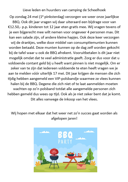 Lieve leden en huurders van camping de Scheelhoek Op zondag 24 mei (1* pinksterdag) verzorgen we weer onze jaarlijkse BBQ. Ook dit jaar vragen wij daar uiteraard een bijdrage voor van €12.50,- p.p. kinderen tot 12 jaar eten gratis mee. Wij vragen tevens of je een bijgerecht mee wilt nemen voor ongeveer 4 personen max. … Continue reading "Grillevent eerste Pinksterdag / Pfingsten"