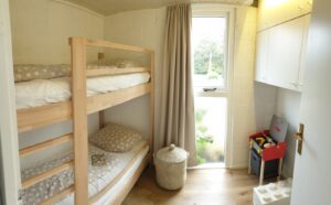 Er zijn twee slaapkamers in het huis, één op de begane grond met een stapelbed, een tweede op de bovenverdieping met een tweepersoonsbed (140 cm) en een kinderbedje.